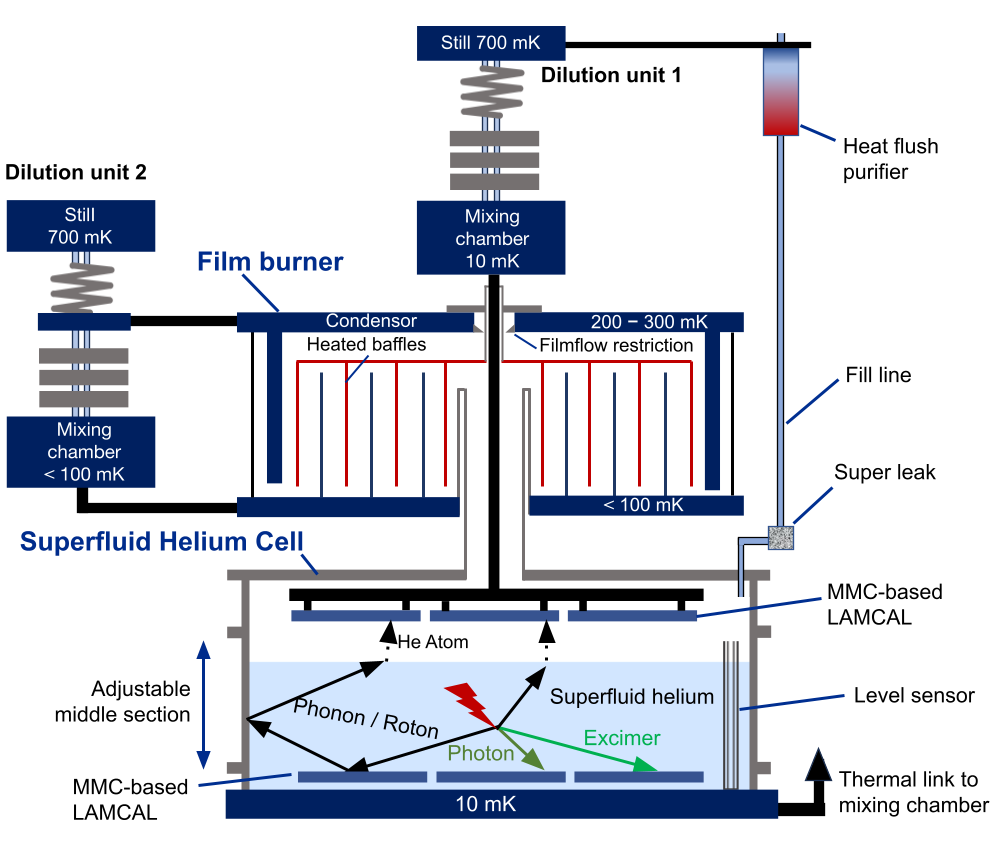 The first phase of the DELight experiment will consist of a ~1L volume of superfluid helium instrumented by Magnetic MicroCalorimeter (MMC) detectors [1]. A schematic of the experimental setup is shown on the right. Above the superfluid helium volume is vacuum. Quasiparticles from particle interactions can liberate helium atoms at the helium surface in a process known as quantum evaporation. The atoms are subsequently detected by MMC detectors positioned above the liquid surface.