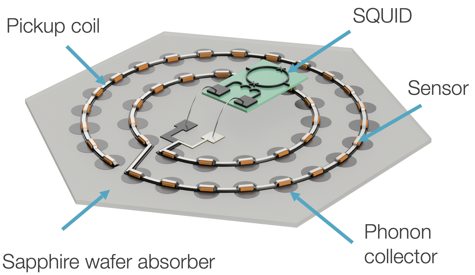 Schematic of a preliminary concept for a DELight LAMCAL.MMCs comprise a particle absorber and a paramagnetic temperature sensor, which is placed in a weak magnetic field, creating a temperature dependent magnetization. When a particle interacts in the absorber there is a resulting temperature increase. The sensor, which is in close thermal contact with the absorber, also increases in temperature, causing a change in magnetization which can be very precisely measured as a change of magnetic flux using a superconducting quantum interference device (SQUID).Dark Matter Sensitivity